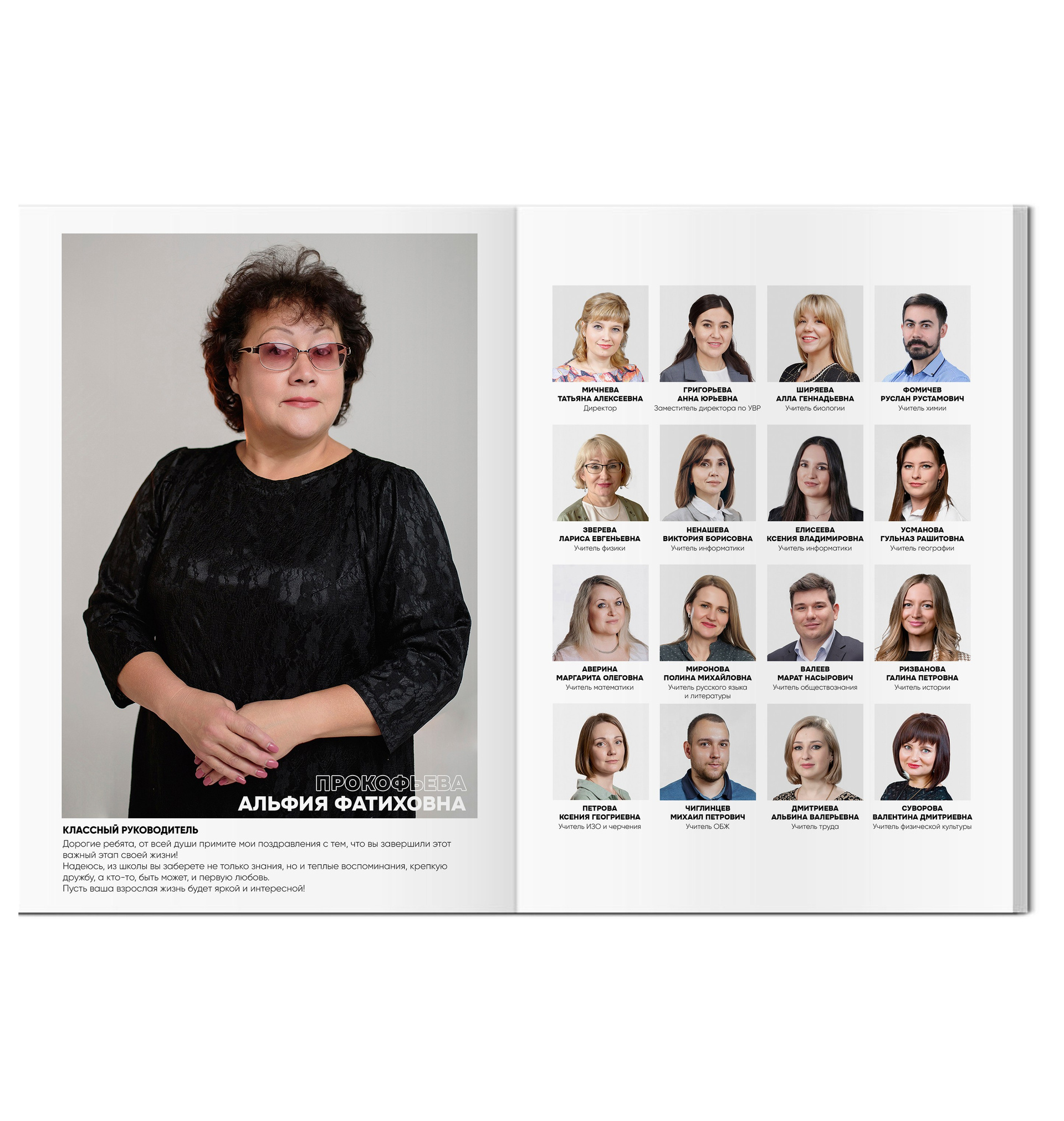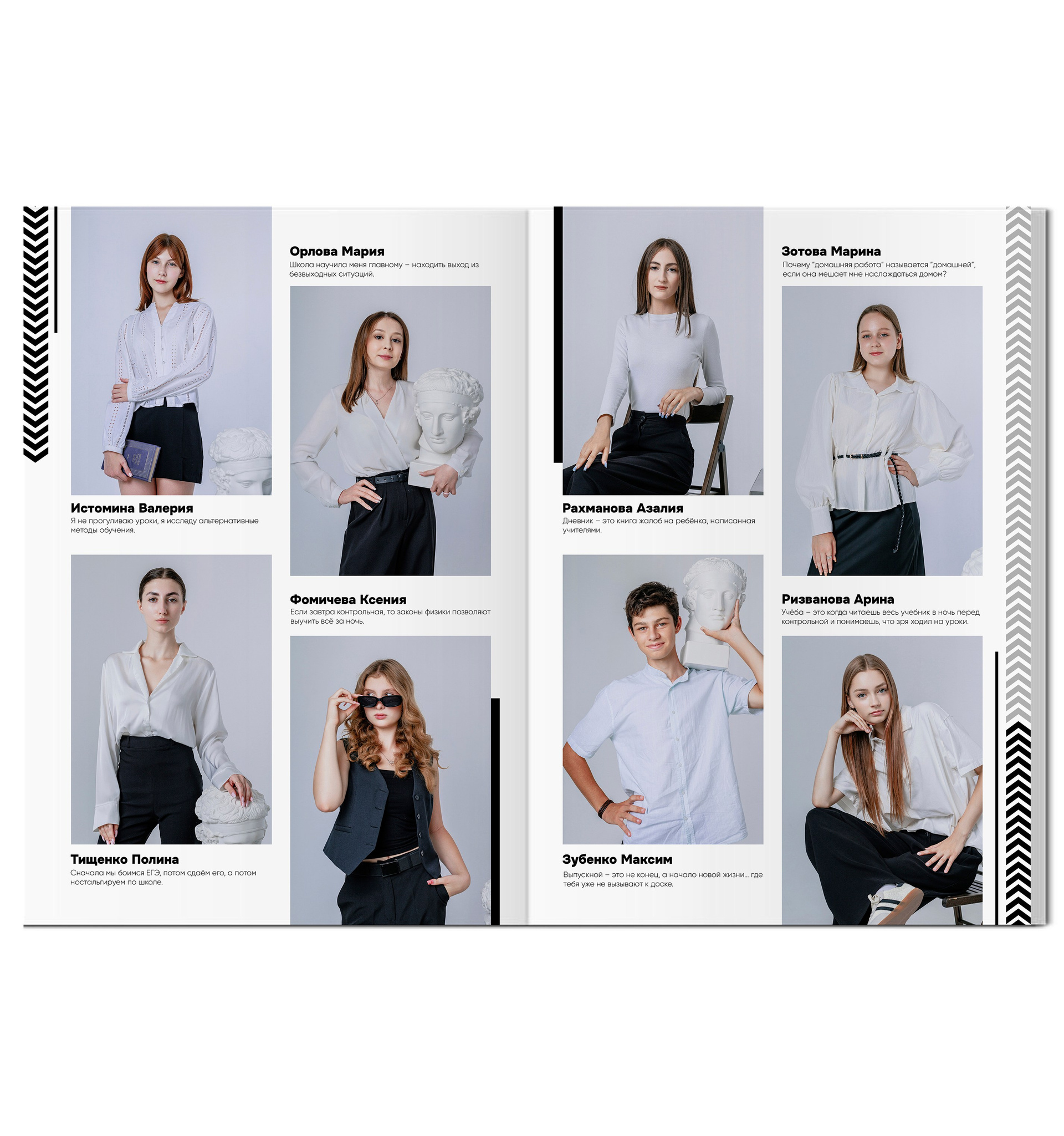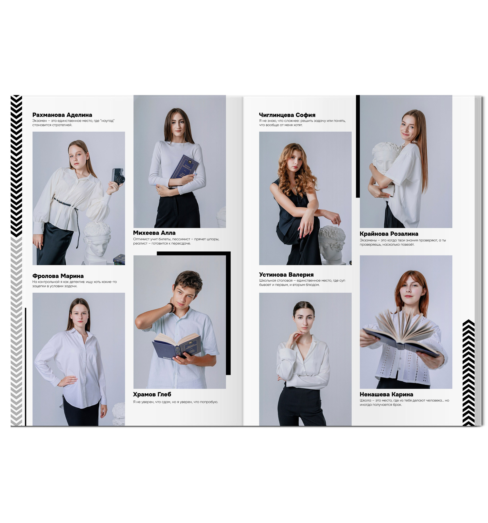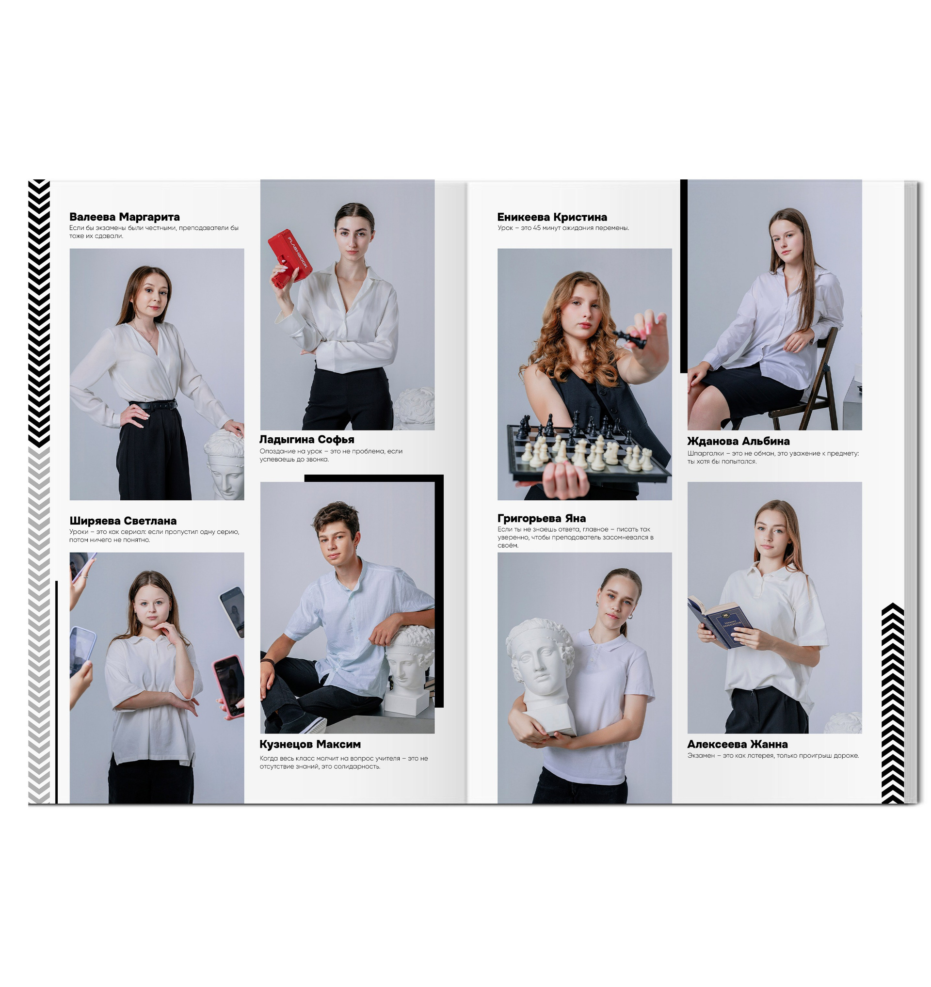 - Портрет каждого выпускника с цитатой (4 человек на страницу)